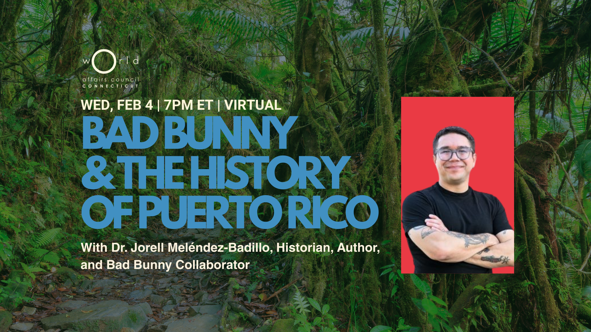 Bad Bunny and the History of Puerto Rico with Dr. Jorell Meléndez-Badillo Feb 4 Bad Bunny and the History of Puerto Rico with Dr. Jorell Meléndez-Badillo 7:00 pm - 7:30 pm